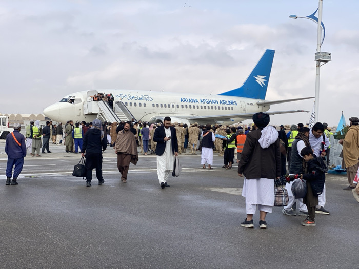 The image displays an active airport tarmac in Unknown, Afghanistan