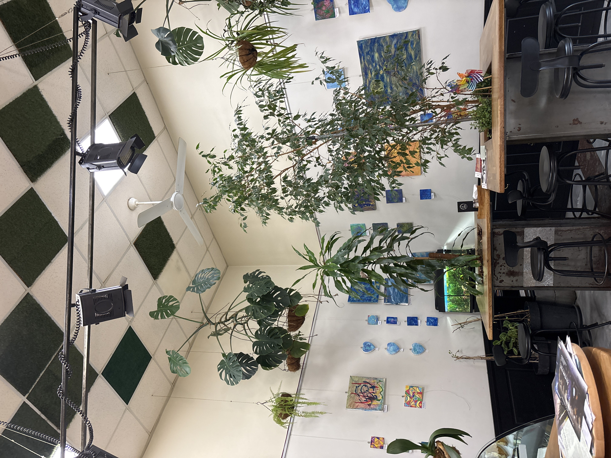 The interior of a building features an eclectic mix of decorative elements. The ceiling is patterned with alternating squares of white and dark green, resembling a checkerboard. A lighting rig with multiple spotlights is positioned on the left side of the frame. A white ceiling fan is also visible. A variety of plants are suspended from the ceiling throughout the room. The walls are adorned with an assortment of artwork, including paintings and sculptural pieces, arranged in a scattered yet curated manner. On the right side of the frame, a wooden bar is seen with bar stools. Magazines and other items are visible on the bar. The location is potentially a cafe or gallery in Stara Zagora, Bulgaria, inferred from the context.