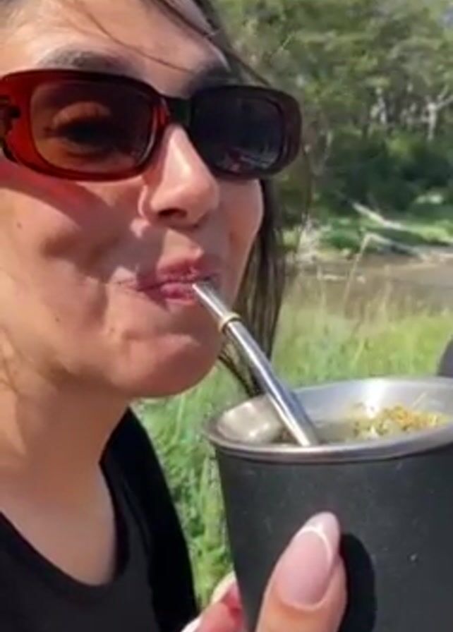 woman drinking from a matte cup, holding it with her left hand. She is wearing red sunglasses and a black shirt. In the background, there is a clear river, trees, mountains, and a blue sky with white clouds. The camera then pans to show more of the river and the surrounding landscape. The mountains are covered in trees, and there are some fallen logs in the river. It is a sunny day, and the video is well-lit.