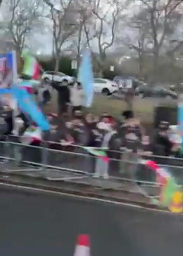 crowd of people standing behind a metal barrier on the side of a road. They are holding various flags, some appearing to be Iranian flags. Cars are driving on the road beyond the crowd. There are trees without leaves in the background. The video appears to be taken from a moving vehicle.