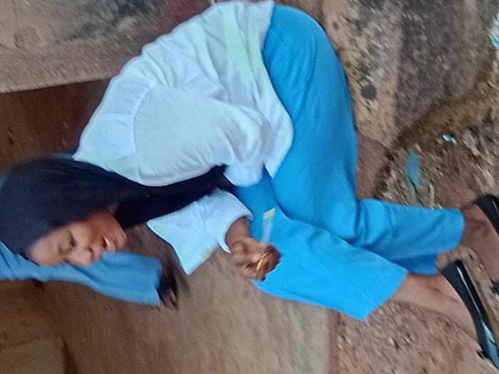 A woman wearing a white shirt, blue pants, and a black headscarf is shown in an outdoor setting