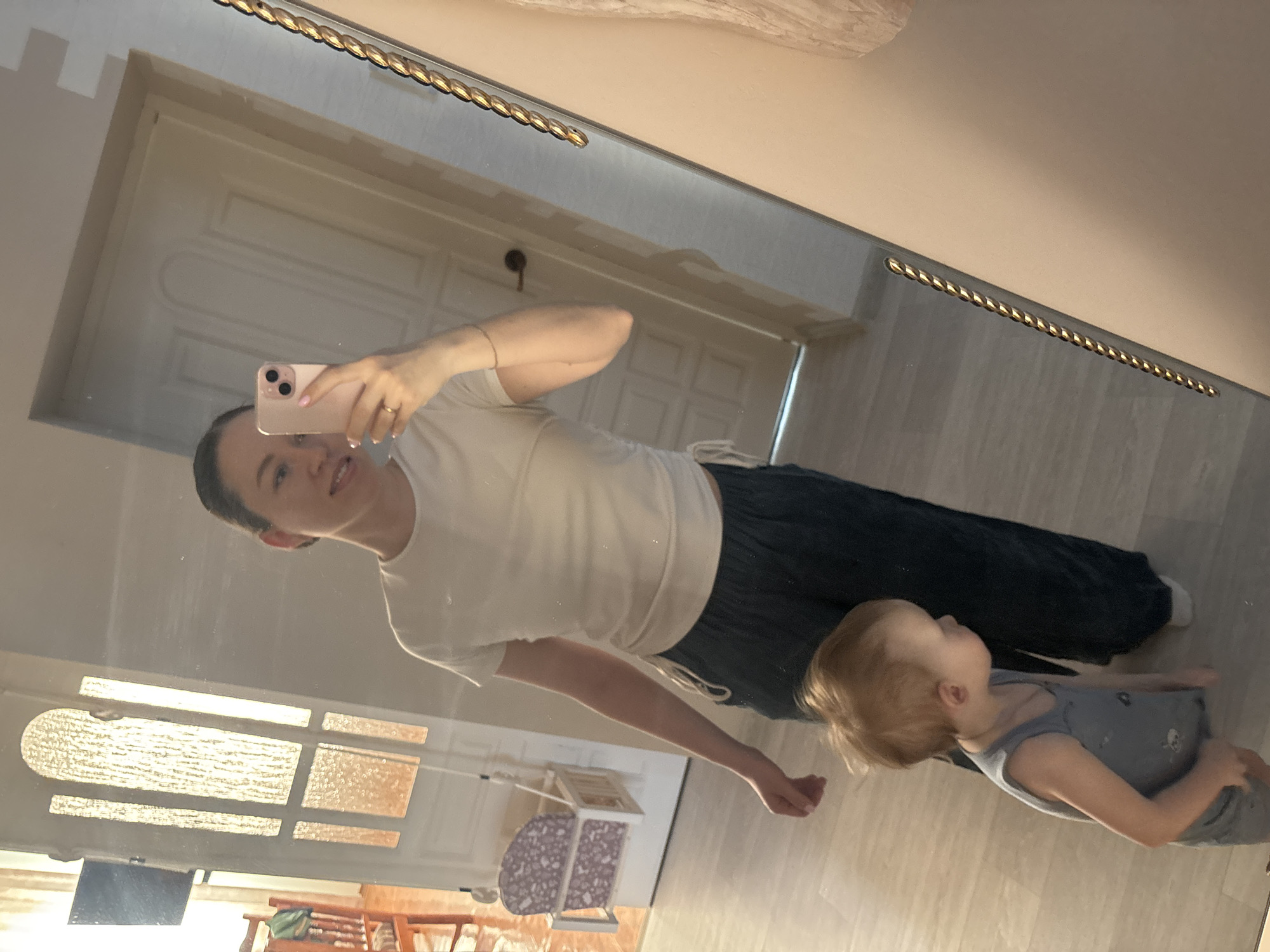 woman taking a selfie in a mirror with a young child. The woman is holding a pink smartphone and wearing a white t-shirt and dark pants. The child is wearing a gray onesie and stands next to the woman. The reflection in the mirror shows the interior of a room. Light comes through a window. Based on the location information (Ферма, Russia), this event is believed to be located in that city.