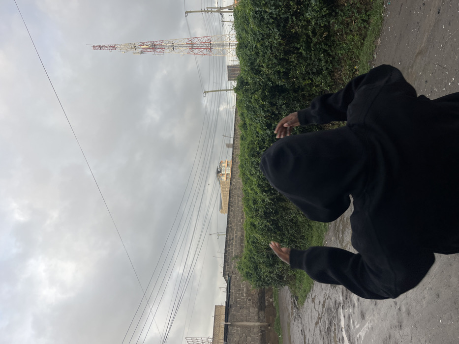 The image depicts a solitary individual viewed from behind, wearing a black hooded sweatshirt, standing on a damp, unpaved path. The person's arms are slightly raised, with open hands and palms facing forward or upward. In the midground, a dense green hedge separates the path from a grey concrete block wall positioned horizontally across the frame. Beyond the wall, several multi-story buildings are partially visible. A prominent, tall telecommunication tower, painted in alternating red and white sections, stands to the far right in the background. Multiple utility poles carrying numerous overhead power and communication lines traverse the upper portion of the scene. The sky is entirely overcast with grey clouds. This scene is located in Ongata Rongai ward, Kenya.