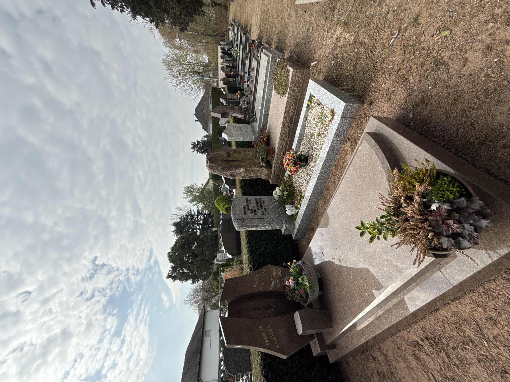 The image displays a segment of a cemetery located in Lingolsheim, France, captured under a partly cloudy sky with discernible blue patches. The scene is illuminated by natural daylight. In the immediate foreground, a multi-tiered grave constructed from polished reddish-brown granite is present, featuring a rectangular planter with a variety of green and purple foliage. To the left, a large, sculpted headstone of the same reddish-brown granite displays two vertical panels, inscribed with "FAMILLE BARTHEL" and the names and dates "ROBERT 1932 - 1984" and "MARIE-LOUISE 1935 - 2013." A concrete planter with colorful flowers rests at its base. Adjacent to the right, a gray speckled granite grave with a white cross-shaped headstone bears the inscription "FERNAND SCHNEIDER 1898-1960" and "COLETTE SCHNEIDER NÉE WEISSHAAR 1931-1988," situated above a bed of small white stones and a floral arrangement. Multiple rows of graves extend into the midground and background, separated by trimmed green hedges and unpaved dirt paths. These graves vary in material, including light gray, dark gray, and reddish-brown granite, showcasing different designs such as upright headstones, ledger stones, and natural rock formations. Many are adorned with potted plants, fresh flowers, and grave lanterns. The background reveals residential structures with dark roofs and light-colored walls, situated beyond the cemetery's perimeter. Deciduous trees with nascent foliage and evergreen conifers are visible, framing the site. The ground consists of dry, reddish-brown soil with sparse groundcover, indicating pathways and areas between plots. No individuals are present within the frame.