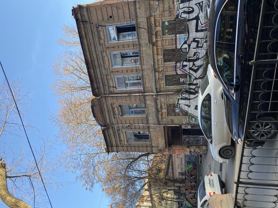 The image depicts an urban street scene in Rostov-on-Don, Russia, under a clear blue sky. The central subject is a two-story, brick building exhibiting signs of age and disrepair. The building's façade features decorative brickwork, with visible cracks propagating across its surface, particularly between the second-story windows and below the roofline. On the second story, three windows are visible; the leftmost appears to be an open, dark cavity, while the other two have light blue frames, with one partially ajar. The ground floor of the building features a large arched entryway on the left, revealing a dark interior. To its right, three rectangular openings, likely former windows or doors, are boarded up with dark, textured material and extensively covered in graffiti. The lower half of the building's brick facade is overlaid with multiple layers of colorful graffiti, including a prominent large tag in white, black, purple, and green. To the left of the main building, additional older structures are visible, along with walls also covered in graffiti. The immediate foreground is partially obscured by a black metal fence. Beyond the fence, a black sedan, possibly a Mercedes-Benz, is parked, with an individual possessing blonde hair visible in the driver's seat. Further into the mid-ground, a white sedan, resembling a Volkswagen Polo, is parked facing right. In the background on the left, a white hatchback, similar to a Lada Granta, is parked facing away, displaying a partially visible Russian license plate. The environment includes numerous deciduous trees, mostly bare of leaves, suggesting autumn or winter. Overhead power or communication lines are visible against the sky in the upper left quadrant. The ground surface consists of asphalt or concrete with visible wear.
