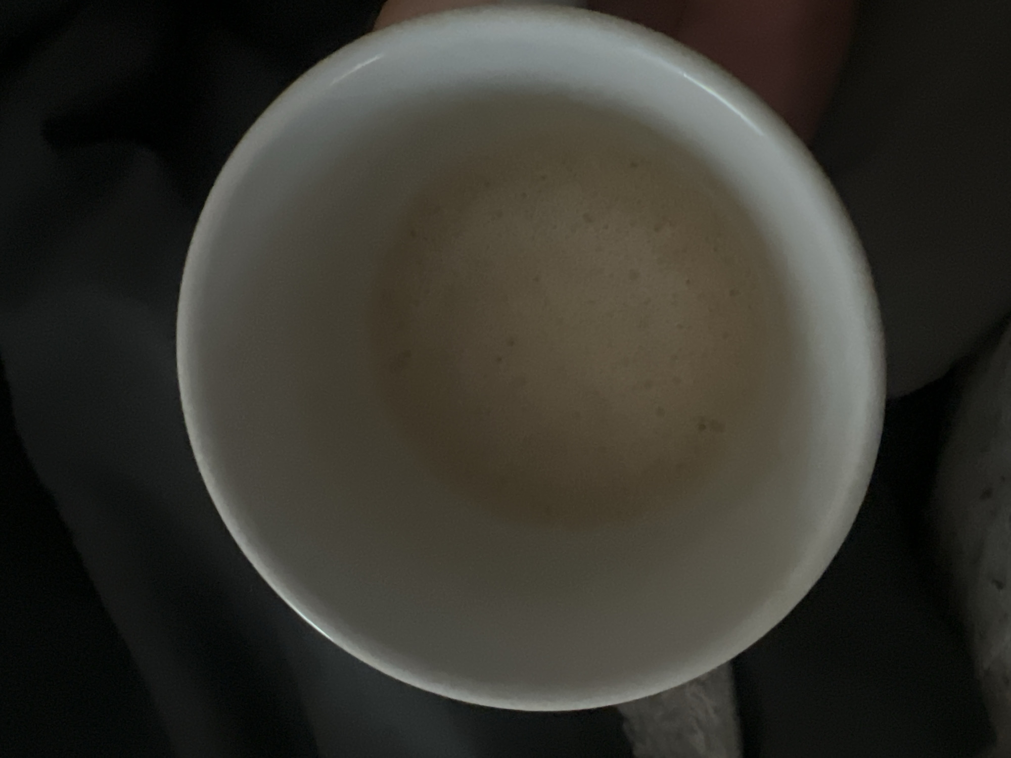 This image presents a close-up, top-down perspective of a white ceramic mug, approximately two-thirds filled with a light brown, foamy beverage. The liquid's surface is consistently covered with small, uniform bubbles, characteristic of frothed milk or a similar preparation. The interior walls of the mug are clean and white, reflecting minimal light. The mug's exterior, including its upper rim and a segment of its side, is visible against a dark, soft, and indistinct background, suggesting an indoor environment, possibly a fabric surface like upholstery. A subtle, light-skinned digit is partially visible gripping the mug on its right side, indicating human interaction. This scene occurs indoors within Vienna, Austria.