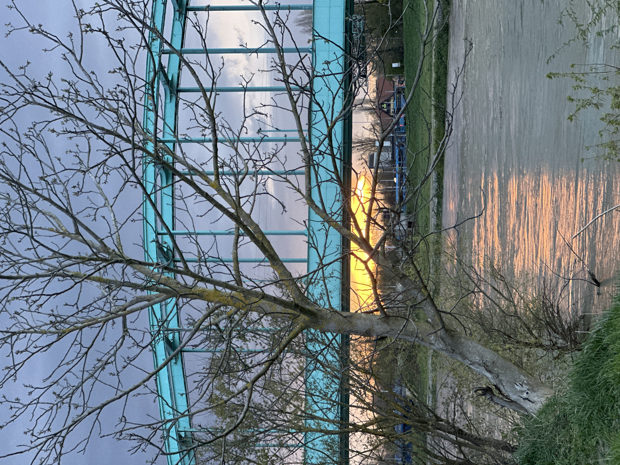 An outdoor scene at sunset in the City of Zagreb, Croatia, depicts the Novi željeznički most (New Railway Bridge) over the Sava River. The sky is largely overcast with dark gray clouds, but a prominent, intense orange-yellow glow from the setting sun is visible at the horizon, particularly concentrated beneath the bridge structure. In the immediate foreground on the left, an embankment covered in vibrant green grass slopes down to the riverbank. Dominating the central foreground is a large deciduous tree with light gray, somewhat textured bark, leaning distinctly towards the river. Its numerous branches are bare but display small, nascent buds, suggesting early spring. Pale greenish-yellow lichen or moss is visible on its trunk. Behind this tree, other smaller trees and shrubs with some light green foliage are present. The Sava River, wide and appearing murky with a grayish-brown hue, flows from right to left. The intense orange light from the sunset reflects brightly on the river's surface towards the left, creating a shimmering pattern. Spanning the river in the midground is the Novi željeznički most, a large, turquoise-blue steel truss railway bridge. Its robust horizontal beams and numerous vertical and diagonal supports are clearly visible, with railway tracks discernible on its upper deck. The bridge is partially obscured by the foreground tree branches. Through the gaps in the bridge's structure and the surrounding foliage, elements of the far riverbank are visible. These include what appear to be low-rise buildings with dark roofs (possibly red or brown) and indistinct blue vehicles, possibly buses, on a road. Distant green land extends beyond these structures. No people or specific human actions are visible within the scene.