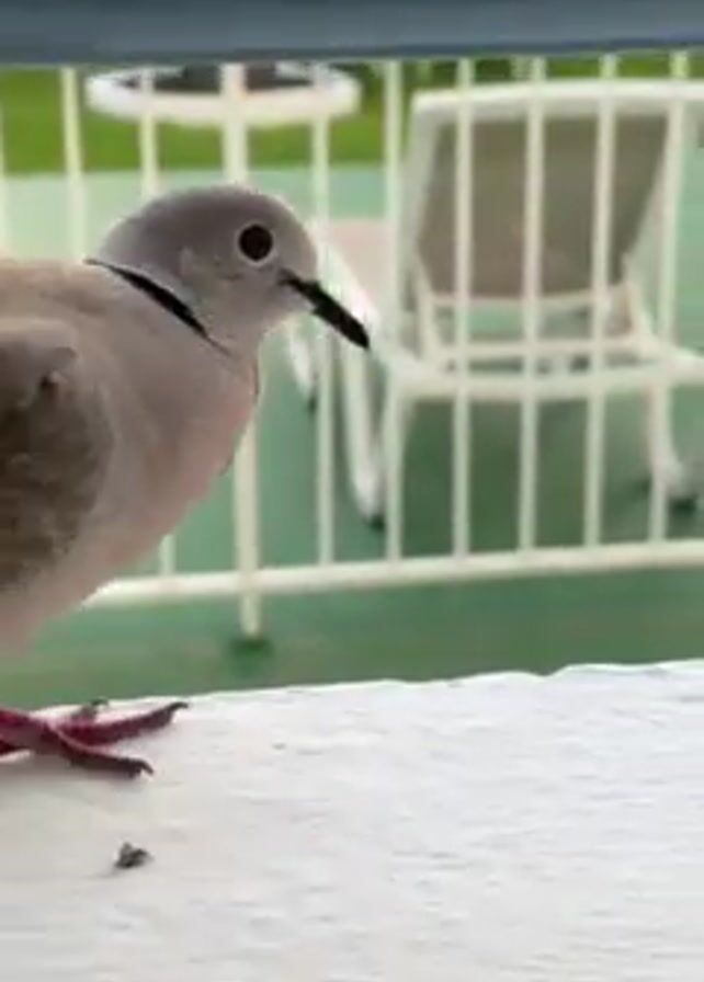 collared dove standing on a white ledge. The bird has light gray-brown feathers and a distinctive black collar marking on its neck. It moves its feet slightly and looks around. In the background is a white railing and some blurred outdoor scenery.