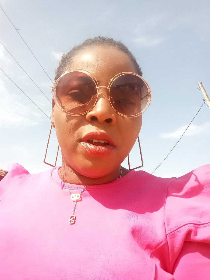 The scene captures a close-up, upward-angled view of a female individual outdoors in Sabon Tasha, Nigeria. The subject has dark skin, braided hair, and wears large, round, light brown-tinted sunglasses with a double-rimmed frame. Her lips are painted reddish-orange and are slightly parted, revealing a sliver of teeth. She is dressed in a bright fuchsia long-sleeved top with prominent puffed shoulders. Accessories include large, rectangular, open-frame earrings (possibly gold-toned) and a silver-toned necklace featuring two white, rounded charms positioned above a dangling 'S' shaped charm. The environment consists of a clear blue sky with minimal cloud cover, multiple parallel utility lines traversing the upper portion of the frame, and a partial wooden utility pole visible on the right. A faint reddish-brown structure is present in the extreme upper left background.