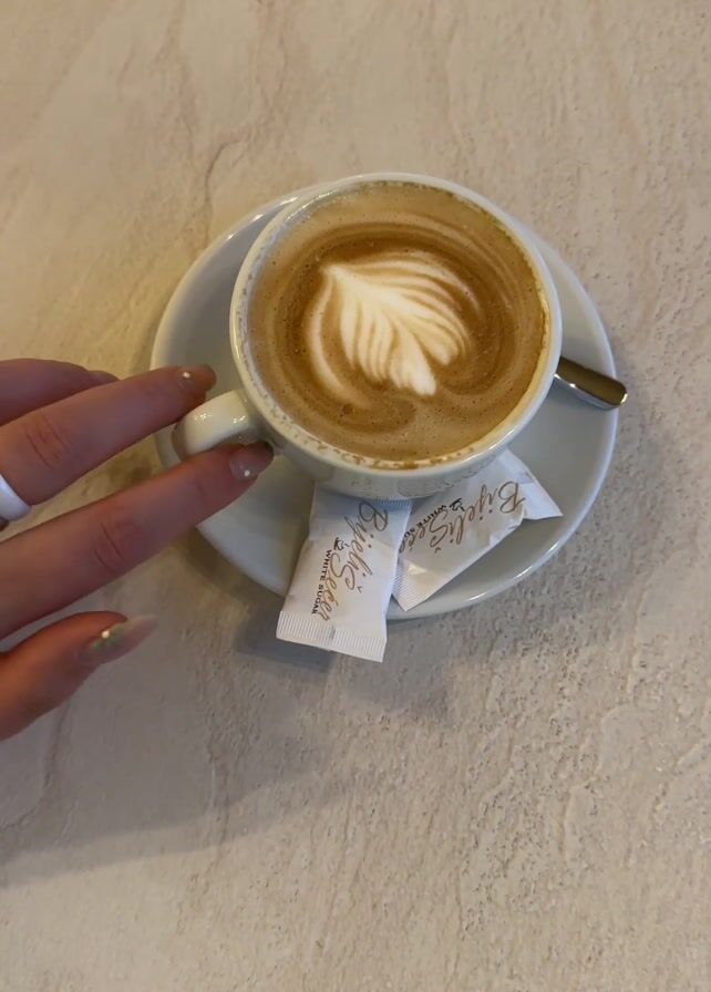 A person's hand, adorned with three rings, reaches for and picks up a white coffee cup. The cup sits on a white saucer, accompanied by two packets of sugar and a small spoon. The coffee has a foamy surface with a leaf-like design. The background is a light, textured surface resembling marble. The hand lifts the cup and then shifts the camera focus, slightly blurring the image.