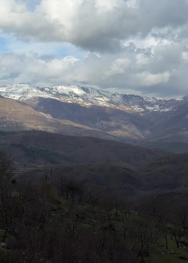 panoramic view of a mountainous landscape under a cloudy sky. In the distance, a mountain range with snow-capped peaks stretches across the horizon. The midground consists of undulating hills covered in a mix of bare trees and patches of greenery. A lake is visible in the valley between the hills. The sky is filled with grey and white clouds, with occasional patches of blue visible. The overall tone is natural and serene.