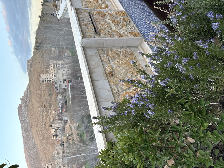 The image depicts an elevated view of a settlement identified as Munin, Syria, under natural daylight conditions, possibly early morning or late afternoon. In the immediate foreground, a structured wall or parapet occupies the lower and right portions of the frame. This wall consists of an upper light-colored, smooth capstone, a middle section of rough-hewn, irregular tan and brown stone blocks, and a lower visible section adorned with blue and white checkered mosaic tiles. Two dark-colored decorative outdoor lampposts with curved arms are mounted on the wall's upper edge towards the right. In front of and slightly below this wall, dense foliage is present. On the left, a shrub with dark green, oval leaves is visible. To its right, multiple rosemary bushes bearing numerous small, light purple flowers are prominent. Beyond the wall, the terrain slopes downwards into a valley or depression where a cluster of residential and commercial-type buildings are situated. These structures vary in size and height, constructed predominantly from light-colored materials, with one distinctive multi-story building appearing roughly five stories tall on the left side of the midground. Sparse, bare deciduous trees, indicative of winter or early spring, are scattered throughout the valley and among the buildings. A dirt path or road winds through the landscape on the left. The background is dominated by a large, dry, and rocky mountain or hill range, appearing arid with minimal visible vegetation. The sky above is a light blue with scattered white and grey cloud formations, particularly towards the right side of the frame. No individuals or active subjects are visible within the scene. The overall environment suggests a semi-urban or rural mountainous setting.