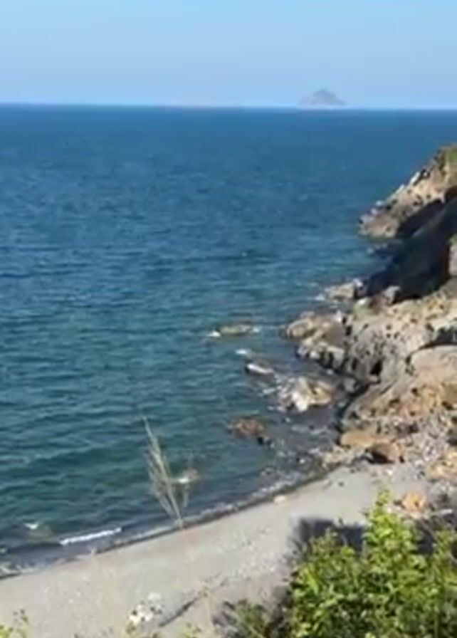 scenic view of a rocky coastline meeting the ocean. The water is a deep blue, with small waves gently lapping against the rocks. In the distance, two small, misty islands can be seen on the horizon. The shoreline is rugged, with large gray rocks and a small, gray-pebbled beach. Green vegetation grows along the top of the coastal cliff. The sky is blue with wispy clouds. The video appears to have been taken during the day in bright, clear weather. The camera slowly zooms in towards the rocky coast.