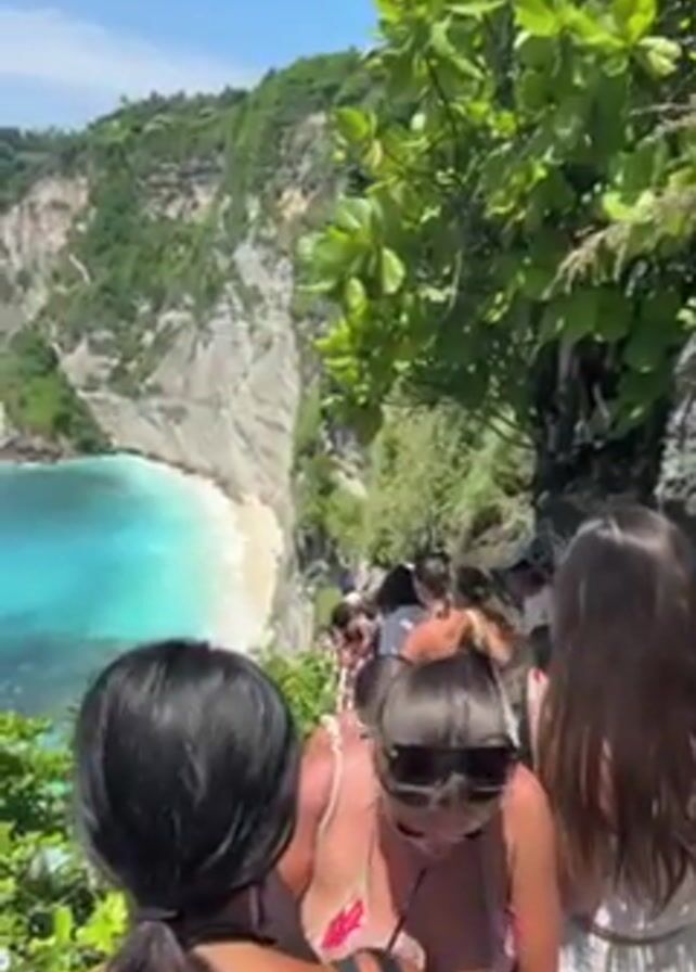 The video depicts a group of people standing on a cliff overlooking a beautiful beach. The water is turquoise blue and the sand is white. The cliff is covered in green vegetation. People are gathered on a narrow path and may be waiting to descend to the beach. The sky is blue and sunny.