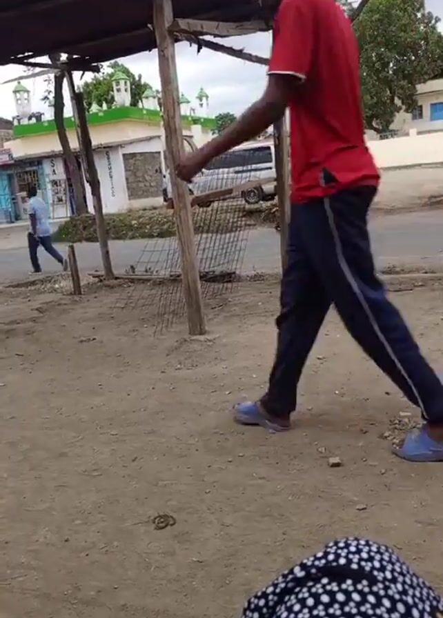 dirt patch under a partially covered wooden structure. Behind the structure is a road with people walking on it. There's a van parked on the other side of the road, and a building with a green roof and several domes is visible in the background. One person walks from left to right into the structure and out the right side. Another person appears to be pushing a cart along the road. The video is shot from a low angle, with a portion of a person's head visible at the bottom of the frame.