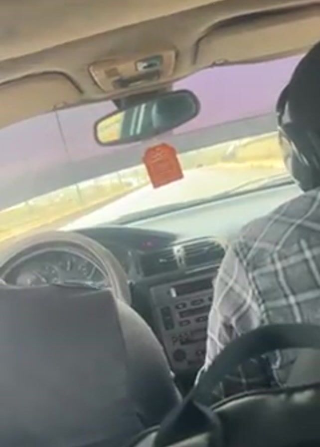 From the backseat of a car, a camera is pointed forward showing the driver and passenger in the front seat