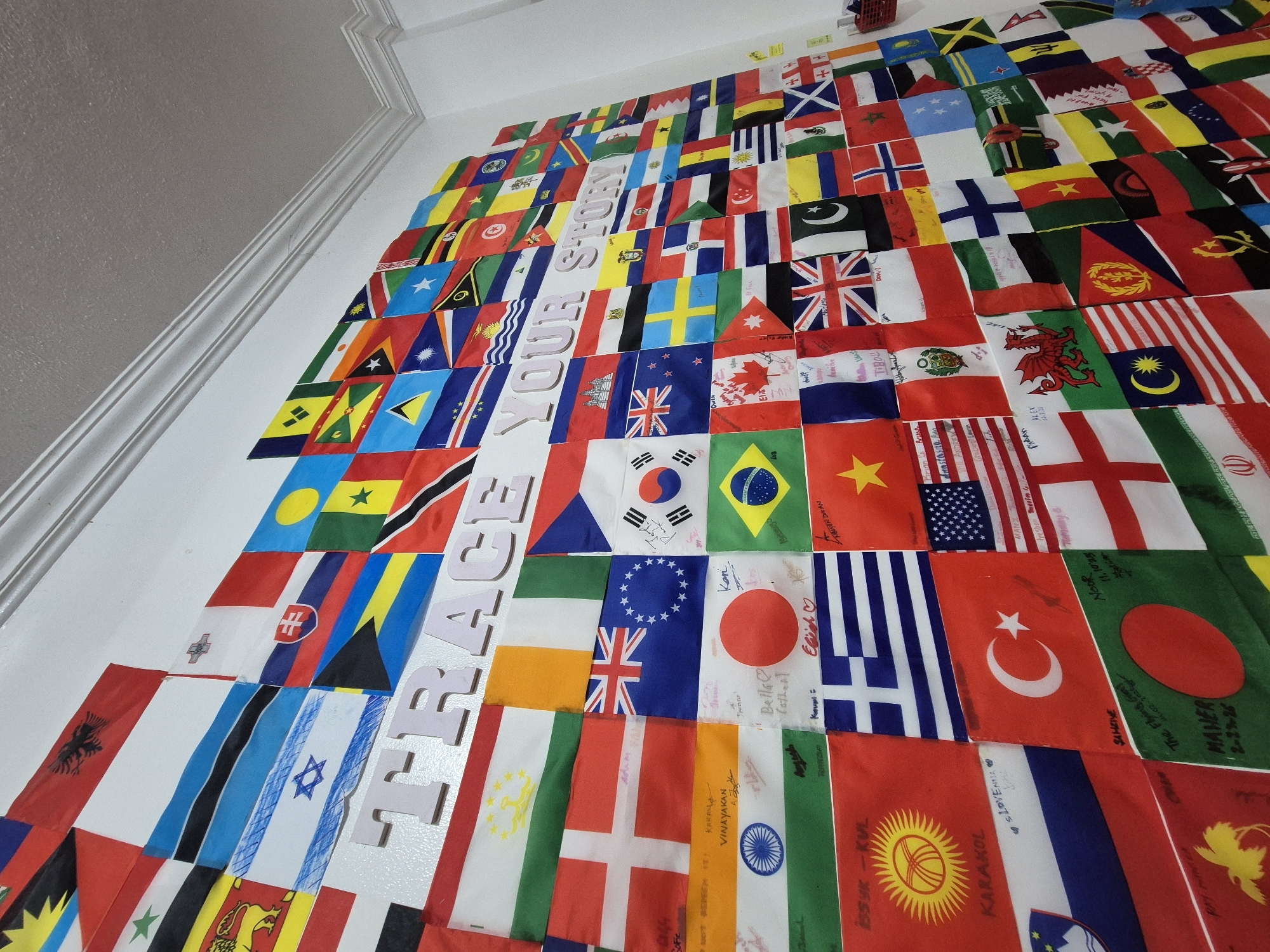 A white wall in Pasay, Philippines, is covered with a dense grid of approximately 150-200 small national flags, spanning from eye-level to near the ceiling. The flags, varying in material from fabric to what appears to be paper or cardstock, represent numerous countries globally. Many of these flags bear handwritten inscriptions, including names, signatures, dates, and short messages, applied with various writing instruments. Notable flags visible include those of Denmark, Japan, South Korea, Brazil, Canada, Turkey, Greece, the United States, the United Kingdom, China, India, Pakistan, Malaysia, France, Peru, the United Arab Emirates, and Jamaica. A hand-drawn representation of the Israeli flag is also present. Raised white sans-serif letters spelling "TRACE YOUR STORY" are affixed to the wall, positioned horizontally across the upper portion of the flag display. The white wall extends to a white ceiling adorned with multi-layered crown molding. A small red wire basket is partially visible in the lower right quadrant of the image, affixed to the wall.