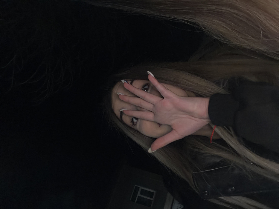 This dimly lit image, captured in Cherven Bryag, Bulgaria, features a female subject partially obscuring her face with her right hand. The subject has long, light brown hair and is wearing a dark jacket. Her right hand, palm facing the viewer, covers the area from her nose to her chin. Her fingers are spread, revealing long, pointed nails with white tips. Both of her eyes are visible above her hand, looking towards the camera. A red string or bracelet is present on her left wrist. On the far right, the long, light brown hair of a second individual is partially visible. The background on the left reveals a blurry, light-colored building with a dark-framed, multi-pane window, and a partial letter (possibly 'R') on a surface below the window. The rest of the background is uniformly dark.