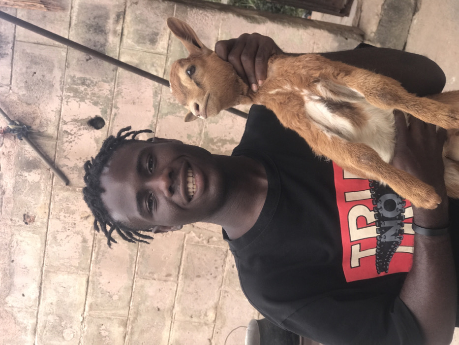An outdoor photograph, taken in Narayi, Nigeria, displays a young adult male holding a small goat