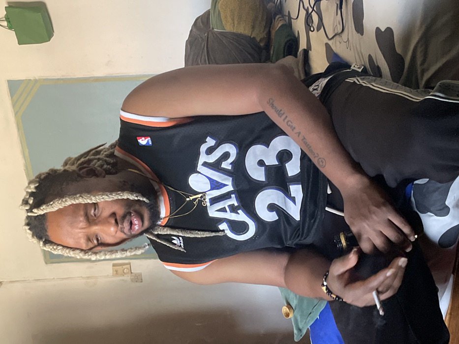 The scene depicts a male individual seated indoors in a residential setting in Jos, Nigeria. The subject, a man with light-colored dreadlocks and a dark beard and mustache, wears a black sleeveless NBA jersey with "CAVS 23" printed in white and blue, featuring orange and white trim. He has two gold-colored chain necklaces, one with a "GOD" pendant and another with a "J" pendant. A multi-beaded bracelet is present on his left wrist. On his right forearm, a tattoo reads "Should I Get A Tattoo?" with a smiley face emoji. He is wearing dark trousers with a visible white drawstring. The man holds a lit cigarette between the index and middle fingers of his left hand, with smoke emanating from it. His right hand grasps a dark-colored bottle with a gold-colored top. His mouth is slightly open, and his gaze is directed downwards and to his left. He is seated on a surface covered with a white and dark-patterned sheet. To his immediate left, a light blue pillow holds a yellow plastic bottle cap. Behind and to his right, a camouflage-patterned fabric object and black electrical cables are visible on the seating surface. The background features a light-colored painted wall, with two electrical outlets visible to the far left. A door frame or opening with a light blue interior is present behind the subject's right shoulder, and a small green bag hangs on the wall to the far right.