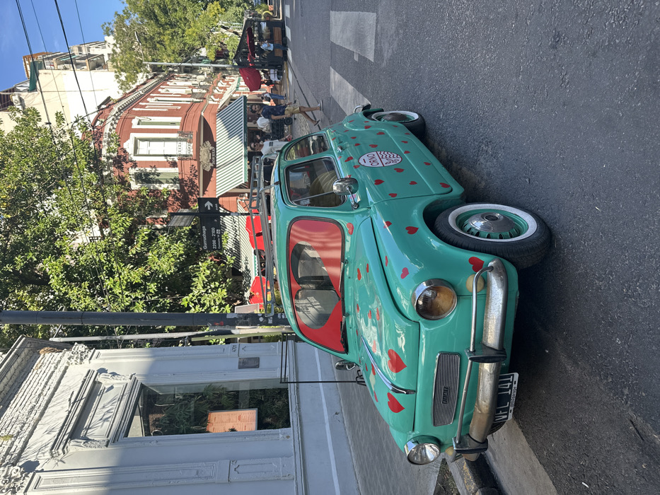 A turquoise Fiat car, decorated with red hearts and a logo, is parked on a city street. The car has a roof rack and red interior accents. In the background, there are buildings with awnings, trees, and a street sign that reads "Gurmchaga" followed by "2200 - 2300". People are gathered near the buildings. The pavement is marked with a crosswalk.