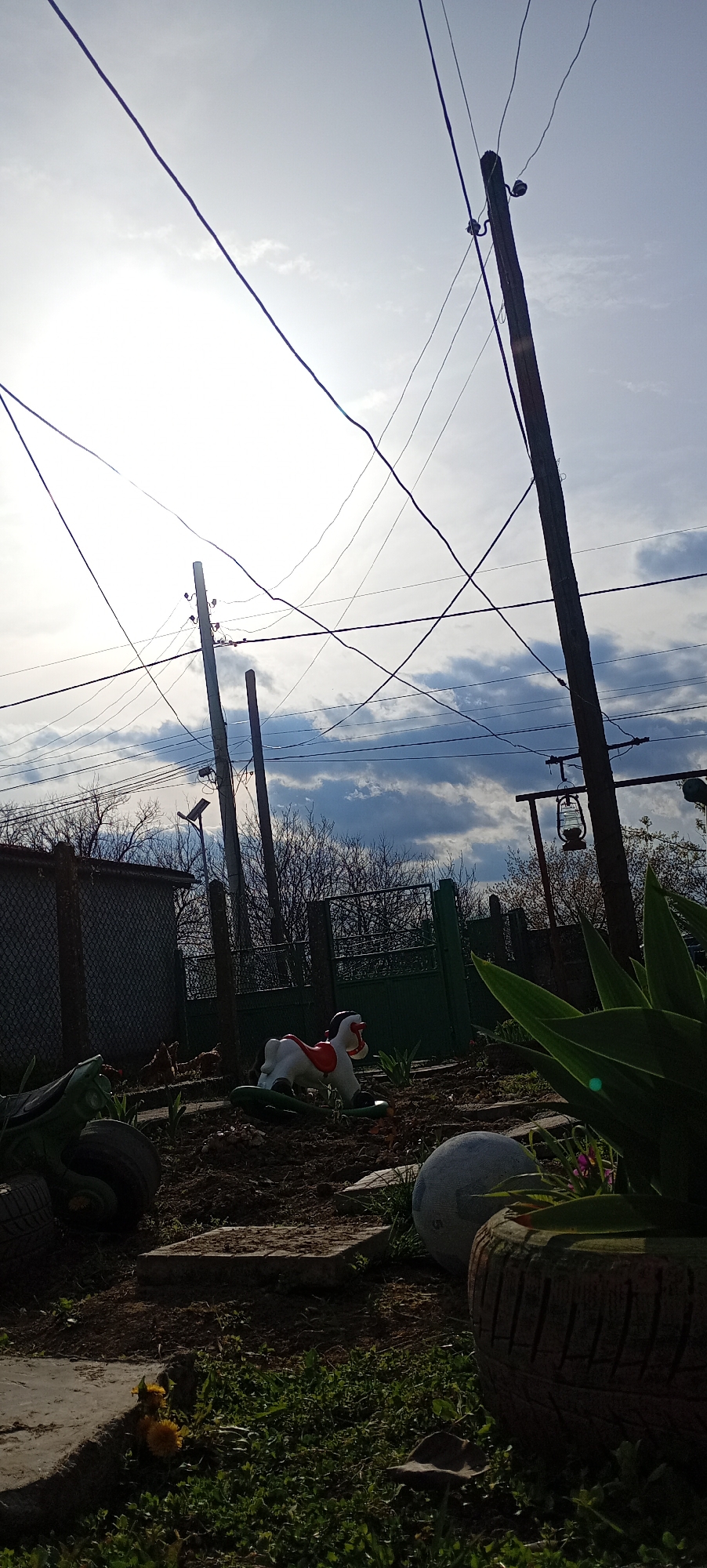 The image depicts a backyard scene in Alfatar, Bulgaria. In the foreground, there are several tires used as planters, a soccer ball, and grass. A rocking horse stands in the middle ground. Behind the horse is a fence, followed by bare trees. In the background, there are utility poles and power lines against a partly cloudy sky. A lantern hangs from one of the poles.