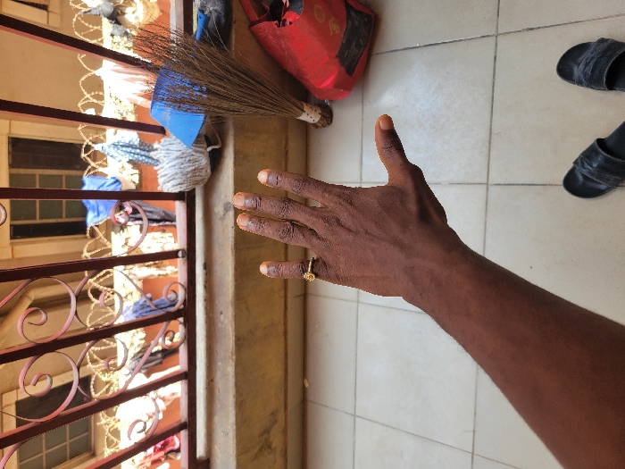 The image depicts a first-person perspective from a balcony in Kidindi, Chad. In the immediate foreground, a dark-skinned human left arm extends from the lower-left corner, with the hand held open, palm down. The fingernails are painted a light orange-brown. A gold-colored ring with a circular motif is worn on the ring finger. Below the arm, the tips of two feet, wearing dark slip-on sandals, are visible on a light-colored tiled floor with a grid pattern. The midground features a beige concrete balcony ledge. Resting on this ledge, from left to right, are a white coiled string or yarn, a blue plastic dustpan, a natural fiber broom with a wooden handle, and a partially visible red object, possibly a plastic bag or container, on the far right. Above the ledge is a decorative reddish-brown metal railing with prominent spiral patterns. Barbed wire or razor wire is strung along the top of this railing. In the background, beyond the railing and security wire, appears a light-colored building with multiple rectangular windows, some visible through the railing. Various items of laundry, including blue and multicolored garments, are hanging to dry on lines or parts of a structure. The scene is illuminated by natural daylight.