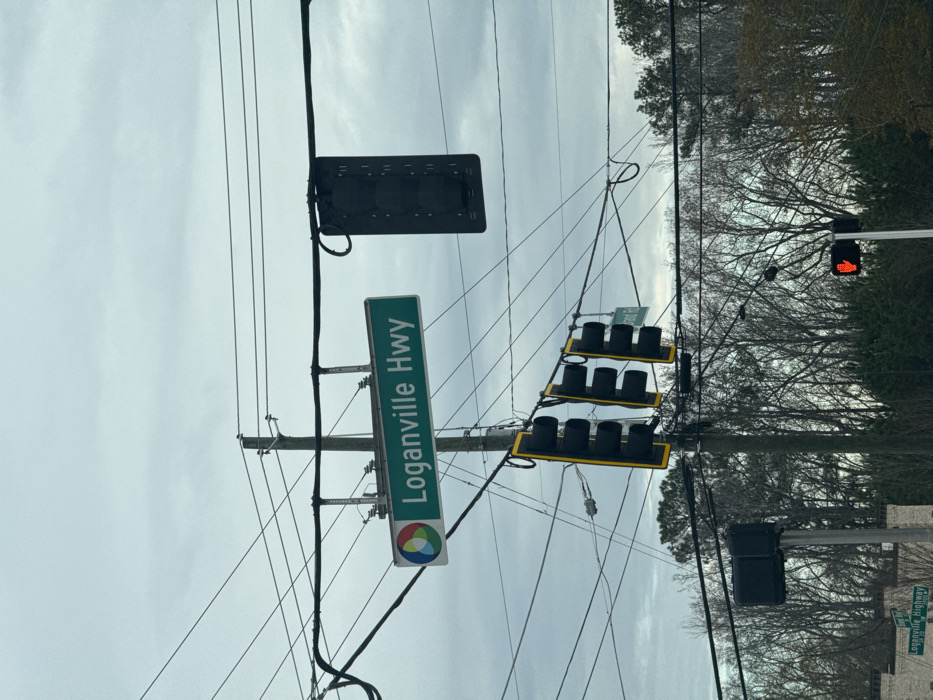 A green street sign reads "Loganville Hwy" attached to a utility pole with multiple electrical wires. Above the sign is a rectangular black structure. Hanging from the wires are traffic signals, three rows of lights attached to each other. Further down, there's another traffic light, which is showing a red light on the right side of the image. The backdrop consists of a gray sky and trees with bare branches. Another "Loganville Highway" sign is visible further down the road.