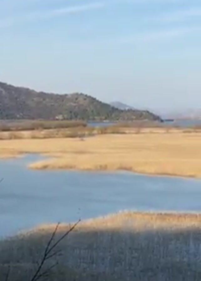 landscape with a lake interspersed with yellow reeds. In the background, there are rolling hills. The sky is blue with some light clouds. In the foreground, there are tree branches and their shadows. The camera pans slightly.