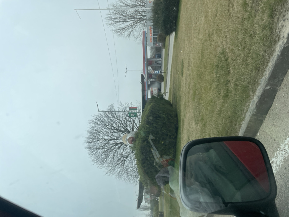 The scene depicts a static display of an older jet fighter aircraft, likely a MiG-15 or MiG-17, positioned on a grassy median within the city of Lyubimets, Bulgaria. The aircraft, primarily white and metallic on its nose, is largely obscured by a mound of dense, manicured green bushes that envelop its fuselage and wings, leaving only the nose, cockpit area, and parts of its wings visible. The nose features a prominent circular intake. Behind the aircraft, a large, bare deciduous tree with a dense network of branches stands against an overcast, light gray sky. A modern streetlight is visible to the right of the tree. Two flags are present: a vertical banner displaying green, white, and red stripes, partially visible, and to its right, a horizontal flag displaying white, green, and red stripes, consistent with the Bulgarian national flag. In the background, to the right of the aircraft, a petrol station is visible with multiple fuel pumps under a canopy structure that partially displays "OMV" branding. Adjacent to the petrol station is a building with "MINI MARKET" inscribed in red lettering on a white facade. Other bare trees and utility poles are present in the distant background. The image is captured from the interior of a vehicle, with the passenger side rearview mirror prominently visible in the lower left quadrant, reflecting a portion of a red vehicle body. A white concrete curb separates the grassy median from an asphalt road in the foreground. No individuals are discernible in the scene. The overall environment suggests a cool, possibly late winter or early spring day due to the bare trees and muted grass colors.