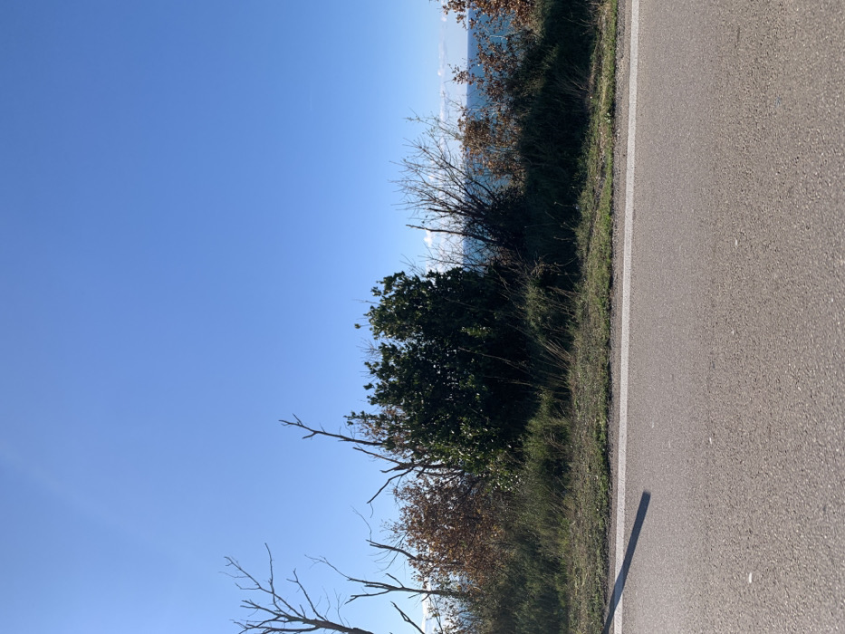 The image depicts a roadside scene in Krstac, Montenegro, under a clear, cloudless blue sky. The lower third of the frame shows a segment of a light grey asphalt road surface, bordered on its right by a solid white painted line. A dark, elongated shadow extends from the left edge of the frame diagonally across the road. Immediately adjacent to the road, an ascending embankment is covered with a mix of green grass and various woody plants. This vegetation includes several deciduous trees with bare, dark brown branches, some exhibiting remnants of reddish-brown foliage, interspersed with dense clusters of dark green evergreen shrubs. In the background, visible above the vegetation, is a horizontal expanse of deep blue water, indicative of the sea. No individuals, animals, or man-made structures other than the road and its marking are present.