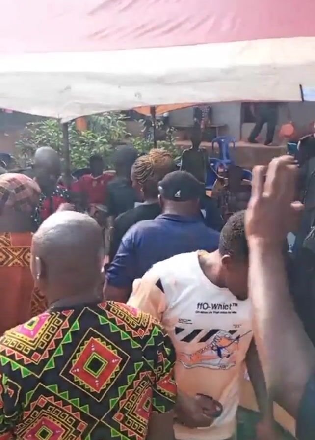 group of people gathered under a red and white tent, appearing to be at an outdoor event. The attendees include both men and women, dressed in a variety of clothing styles, some traditional and some modern. One man in a black outfit, potentially security personnel, appears to be using a phone to record the gathering. The environment is outdoors, with houses visible in the background. Some people are seated, while others are standing. The lighting seems to be daylight.
