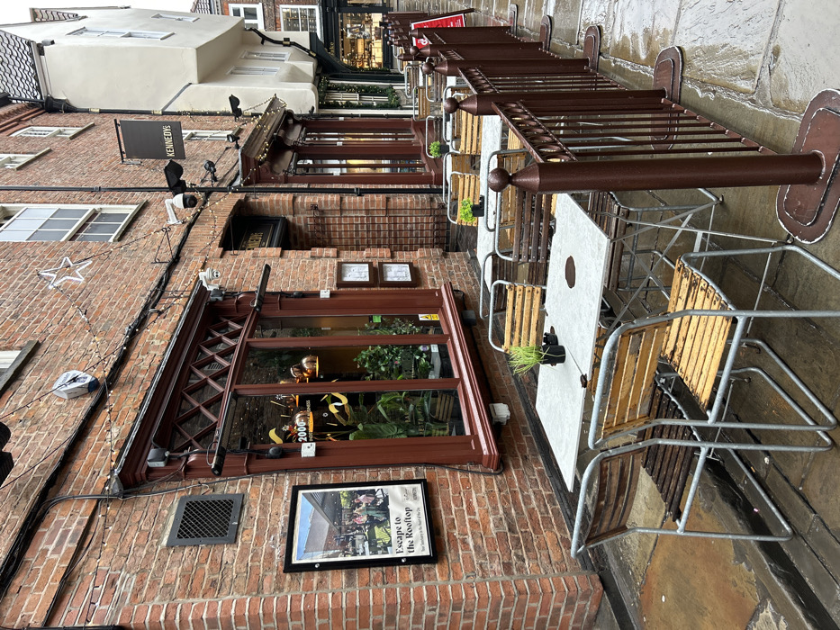 The image displays the exterior of Kennedy's Bar & Restaurant located on Little Stonegate in York, United Kingdom. The scene is a narrow, wet flagstone street, implying recent or ongoing precipitation, with reflections visible on the pavement. The primary building on the left is constructed of reddish-brown brick, featuring multiple stories. The ground floor houses Kennedy's, identifiable by a prominent black hanging sign with "KENNEDY'S" in white text positioned above the main entrance. The establishment's windows and door frame are painted a dark red-brown. A large display window on the left reveals interior greenery, gold-toned decorations, and a "2000" sign. To the left of this window, a black-framed poster titled "Escape to the Rooftop" with an image of a busy outdoor patio is mounted on the brick wall. Security cameras, outdoor heaters, and decorative string lights are affixed to the building's facade. An outdoor seating area occupies the wet pavement directly in front of Kennedy's. It consists of multiple square tables with light-grey tops. Each table is surrounded by chairs featuring metal frames and wooden slats, some exhibiting wear. Small green potted plants are placed on some tables. This dining area is demarcated by a series of dark brown metal barriers with decorative finials. To the right of Kennedy's, an older building with a distinctive white, timber-framed upper story is visible. Further down the street, additional commercial premises are partially obscured. No people are present in the scene.