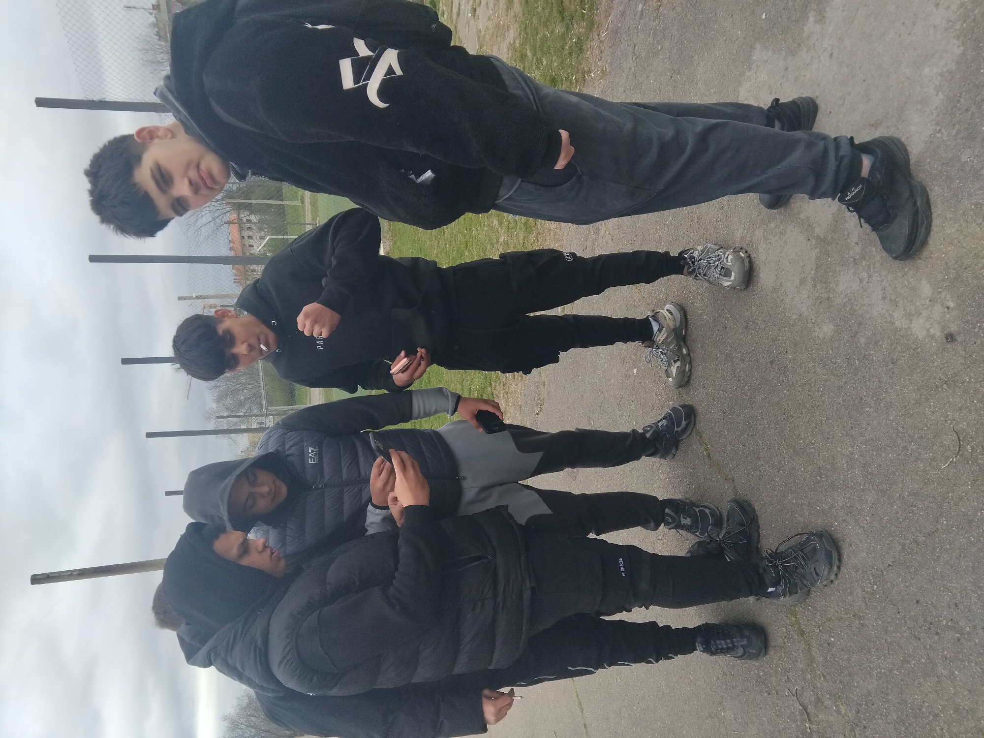 - "Five young adult males are depicted outdoors on worn asphalt pavement beneath an overcast sky" by FM-BLHXC2, licensed under CC BY 4.0