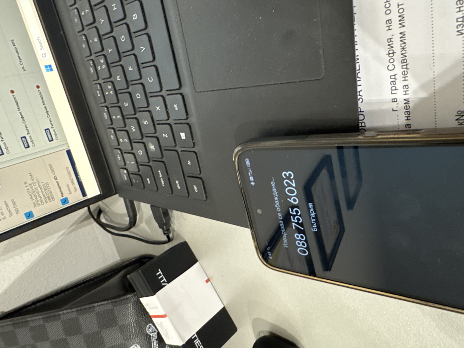 The image displays an overhead view of a desk scene. In the foreground, a black smartphone encased in a clear protective cover is oriented horizontally, displaying an active outgoing call with the number "088 755 6023" and the country "България" (Bulgaria) visible on its screen. Reflections of two square light fixtures are visible on the phone's dark screen. Immediately behind the smartphone, a black laptop is open, its screen angled upwards. The laptop's keyboard features a QWERTY layout. The laptop screen displays a tabular interface with text predominantly in Bulgarian. Visible details on the screen include "София Титан София Младост", "ул. Стрешер №5", "Наемател ID: 435987", "750 Евро", and a search bar with a Windows logo. A black USB cable is connected to the left side of the laptop. To the left of the laptop, a dark, patterned object, possibly a wallet or bag, is partially visible. Below this object, a stack of white items with black bands, bearing the partial text "ТІТЛ", is present. To the right of the smartphone, a document is visible, partially obscured, with the text "...г., в град София, на осн..." (...year, in the city of Sofia, on the basis of...), "...а наем на недвижим имот" (...a rent for real estate), and "Договор за наем" (Lease Agreement) indicating its nature. The overall scene suggests an indoor setting, likely an office or home workspace, with the laptop screen and document confirming the location as Sofia, Bulgaria, specifically mentioning "София Титан София Младост" and "ул. Стрешер №5".