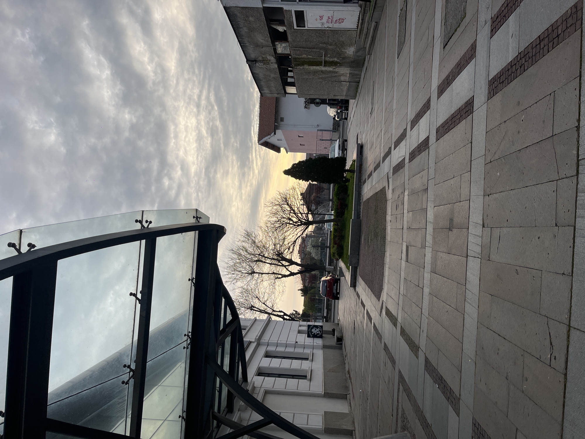 The image depicts a street scene in Nova Zagora, Bulgaria. The view is along a pedestrian walkway composed of rectangular paving stones with alternating strips of smaller, darker stones running lengthwise. On the left is a modern glass and metal structure, possibly an entrance to an underground facility. Adjacent to this, a white building with windows is visible. Further down the walkway, there's a line of trees with bare branches, and beyond them, a glimpse of other buildings in the distance. A red car is parked along the walkway. The sky is overcast, with light filtering through the clouds, suggesting it might be near sunset or sunrise. The overall impression is a quiet, urban scene.