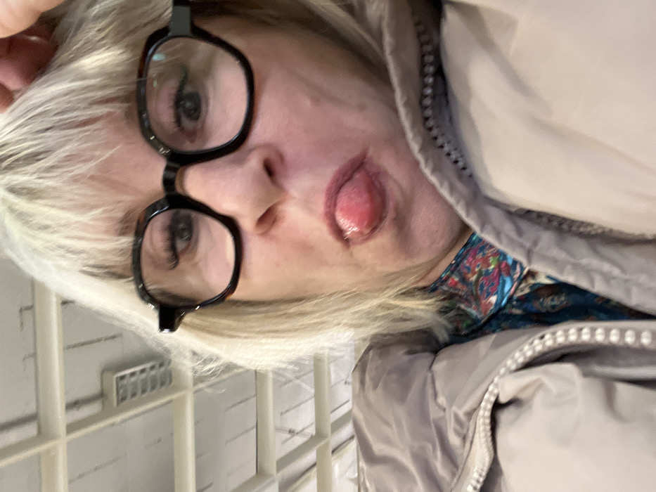 A blonde-haired woman with bangs and dark, thick-rimmed glasses is depicted in a close-up, chest-up shot. Her left hand is positioned above her head, partially visible. She is making an expressive face, with her tongue extended. She is wearing a beige puffer jacket over a blue shirt with a multi-colored patterned design. The background shows a light-colored indoor ceiling with exposed structural elements and rectangular light fixtures. The specific location within Andrézieux-Bouthéon, France, cannot be determined from the visual evidence.