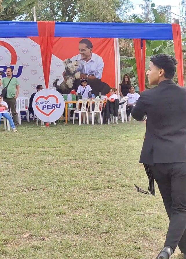 A young man and a young woman are performing a traditional Peruvian dance on a grassy lawn. The man is wearing a black suit, black shoes, and a straw hat. The woman is wearing a red and white traditional Peruvian dress with white flowers in her hair. The background shows a banner with the words "SOMOS PERU" (We are Peru) and a picture of a man holding a monkey. A group of people are seated behind a table in the background. The scene appears to be a political event or community gathering. The man spins and twirls his hat, and the woman gracefully moves her dress.