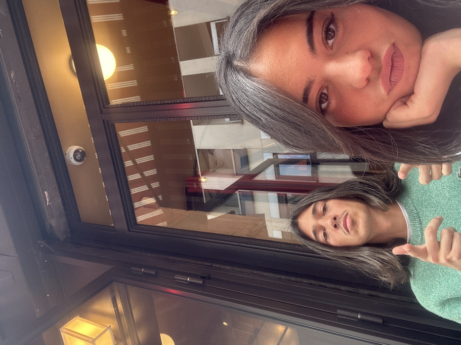 Two individuals, a male and a female, pose for a photograph outdoors in Paris, France, against the background of a commercial building facade, likely a cafe or restaurant