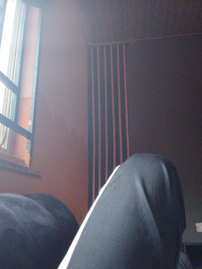 A dimly lit room features a window with metal bars on the left side. A peach wall surrounds the window. Next to it, a dark brown wall with subtle vertical stripes is visible. A person's legs, clad in black pants with white stripes, are positioned in the foreground. A portion of a dark gray couch is also visible on the left, creating a sense of casual comfort. The overall impression is of someone relaxing indoors during daylight.