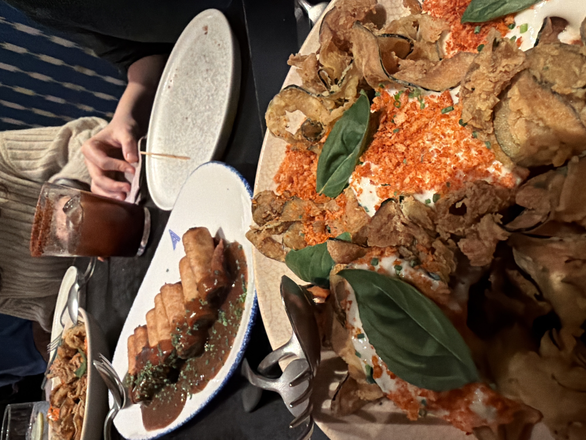 The image depicts an indoor dining scene at Astelena 1997, a restaurant located on Calle del Puerto, 3, in the Parte Vieja (Old Town) of San Sebastián, Spain. The perspective is a close-up, downward view of a restaurant table laden with multiple dishes of food and drinks in a dimly lit, warm environment. In the foreground, a large, light-colored oval serving bowl contains a generous portion of fried, thinly sliced vegetables (likely eggplant or zucchini) arranged over a white sauce, garnished with bright orange, granular crisps and fresh green basil leaves. A metal serving spoon and fork are resting on the rim of this bowl. In the middle ground, a long, white rectangular plate with a blue rim and a stylized 'A' logo holds approximately eight golden-brown, cylindrical items, possibly stuffed rolls or croquettes, partially covered in a dark brown sauce and sprinkled with green herbs. To the right of this, an empty, off-white oval plate features a single wooden toothpick, suggesting a recently consumed item. Behind these plates, the right hand of one diner, wearing a light-colored ribbed sweater, rests on a napkin next to a clear glass containing a dark red beverage with ice, the rim of the glass coated in a red spice blend. Further in the background, another round plate contains additional fried items, and a glass with a clear liquid and a lemon slice is visible. A second diner's torso, wearing a dark garment with blue and white stripes, is partially visible on the far right. The table surface is dark and reflective.