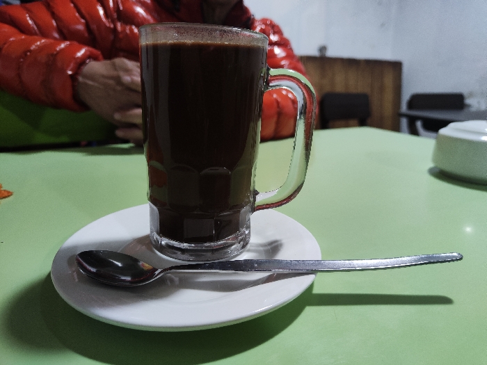 A tall glass mug filled with a dark beverage sits on a white saucer. A metal spoon rests on the saucer, its handle extending towards the right. The table surface is a pale green. In the background, a person in a red jacket is visible, along with a wooden panel and dark chairs. A white, rounded object is partially visible on the right edge of the table.