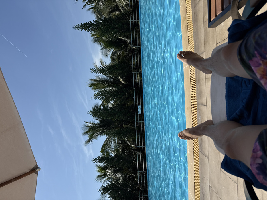 A person relaxes by a pool, feet dangling near the water's edge. The pool's bright blue surface reflects sunlight, next to a tiled border. Palm trees and a blue sky create a vacation backdrop. The individual wears floral shorts and reclines on a chair with a blue towel. A sun umbrella is partially visible in the bottom left. The image captures a relaxed, sunny day at a tropical location.