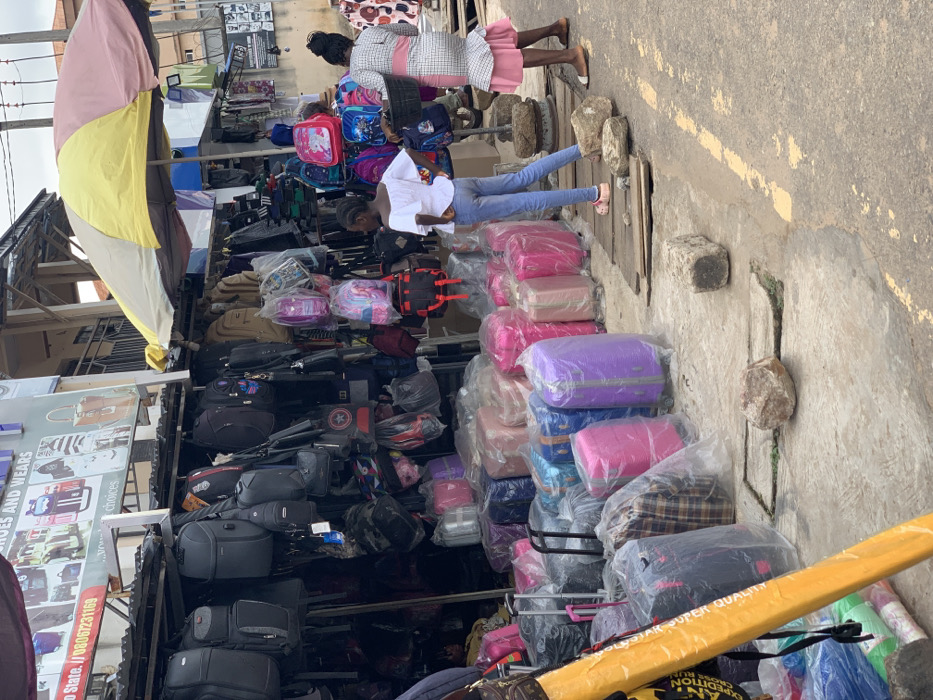 The scene is a street market in Ondo, Nigeria, located at 7.252 latitude, 5.199 longitude. There are many colorful suitcases on display, some wrapped in plastic, as well as backpacks and other luggage. Three people are present: a woman in a pink dress, a woman in a white shirt and blue jeans, and a woman in a white shirt and black pants. The woman in the pink dress is standing near the suitcases, looking at the camera. The woman in the white shirt and blue jeans is standing near the backpacks, looking to the left. The woman in the white shirt and black pants is standing behind the woman in the pink dress, looking to the right. The market is set up in front of a building with a sign that reads “SHOES AND WEARS.” There is a yellow umbrella above the market, and the ground is concrete.
