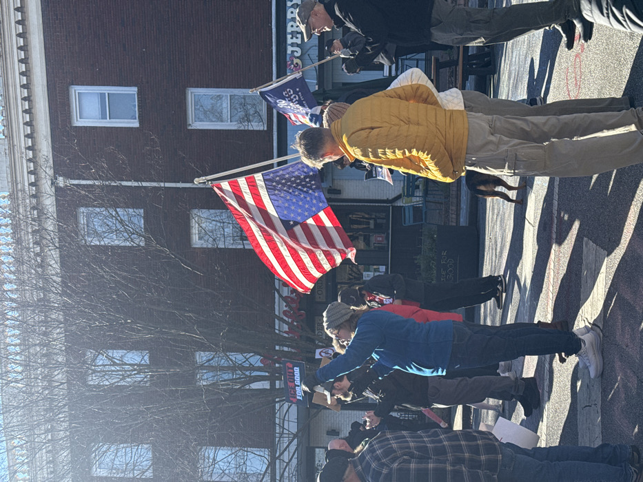 A small group of people stand on a street, several holding signs. An American flag waves prominently. A brick building is visible behind the crowd with several windows. Some people wear casual clothing, including a yellow jacket and a blue jacket. A dog is also present in the scene. Sunlight casts shadows across the street.
