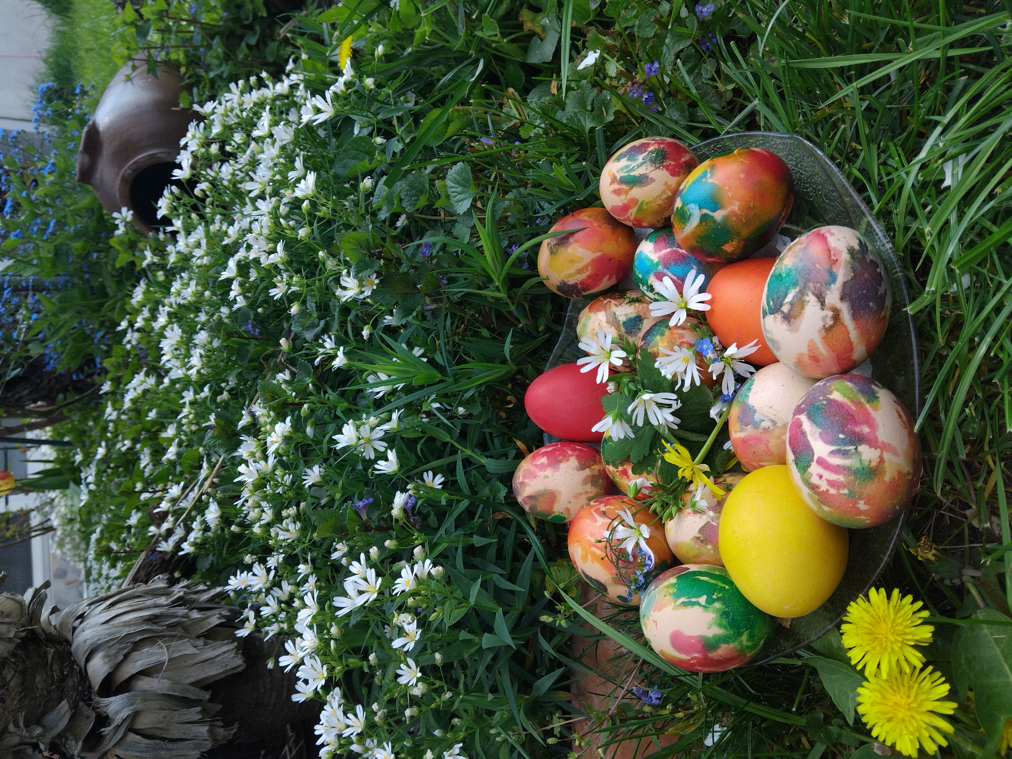 The image depicts a garden scene, likely in Nova Zagora, Bulgaria, given the prompt's specifications. A collection of Easter eggs sits in a clear glass bowl amidst a bed of green grass, small white and blue flowers, and dandelions. The Easter eggs vary in color, with some being solid shades of red, orange, and yellow, while others are marbled with multiple colors. A large clay pot sits among the vegetation. The scene seems to be a display or arrangement, possibly for a celebration or decoration.