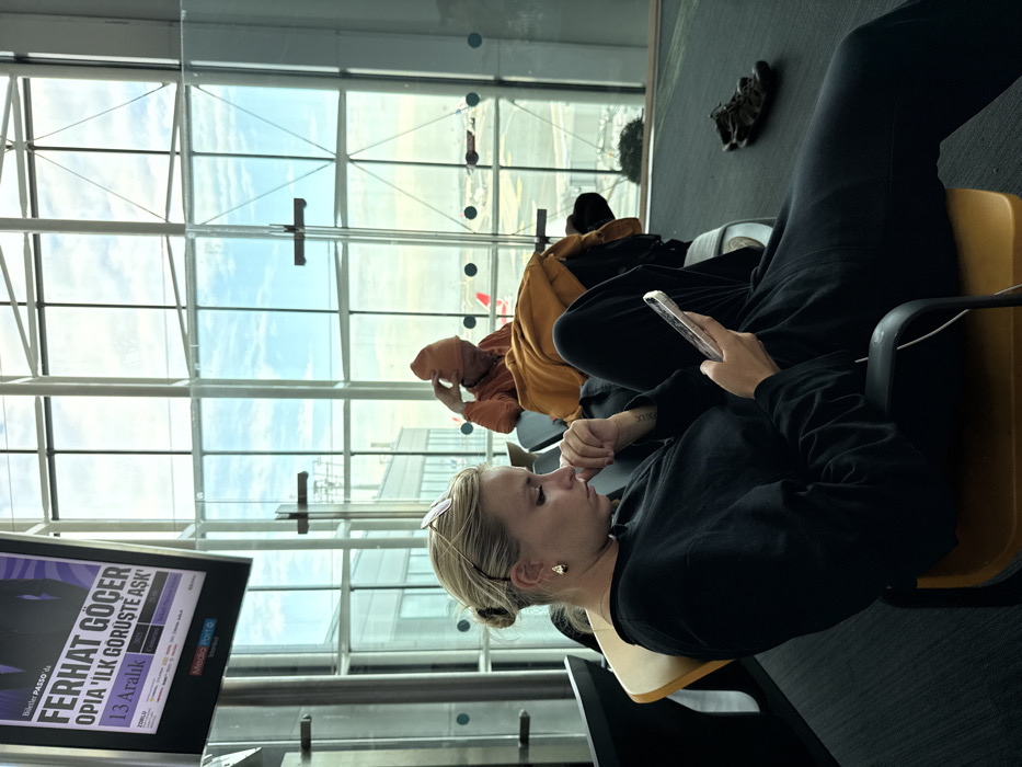 This image depicts a modern airport waiting area at Istanbul Airport (IST) in Arnavutköy, Turkey