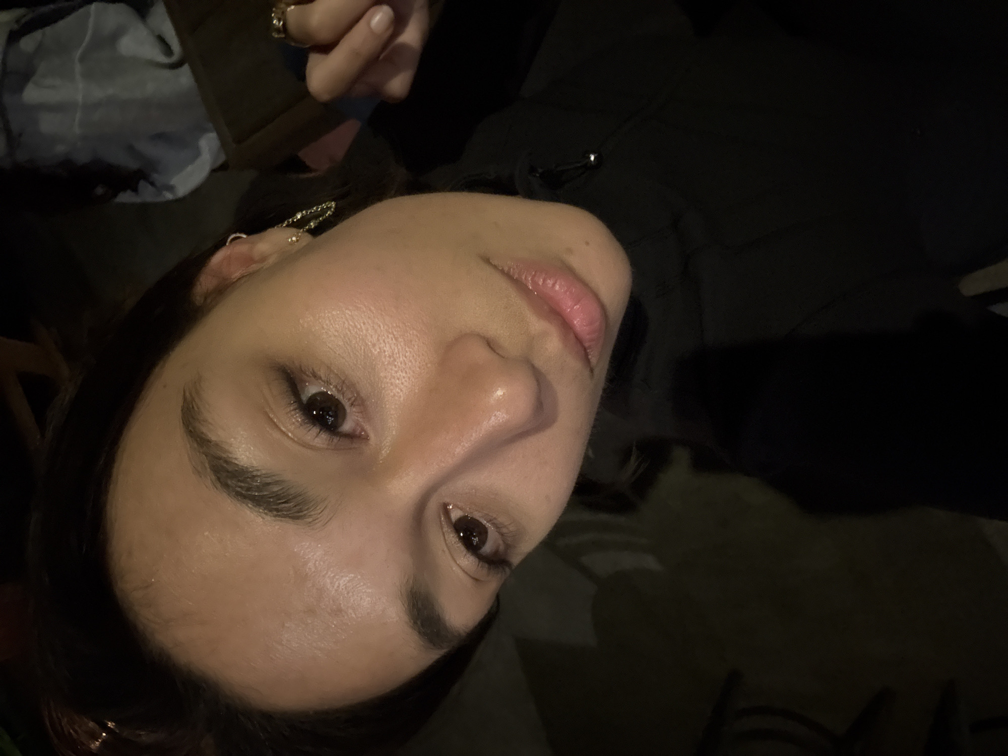 A female individual is depicted in a close-up portrait within the city of Kahaluu-Keauhou, United States of America. She possesses dark brown hair, a medium skin tone, dark brown eyes with visible eyelashes, and full dark eyebrows. Direct frontal illumination highlights her forehead, nose, and cheekbones, imparting a reflective quality to the skin. The subject wears a dark, possibly black, zippered top. Accessories include a small silver-toned hoop earring in the helix of her right ear, a gold-toned chain-dangle earring from her right earlobe, and a gold-toned ring with an intricate design on the fourth digit of her right hand. Her right hand is partially visible towards the upper right of the frame. The background is dark, out of focus, and visually indistinct, indicative of a low-light environment.