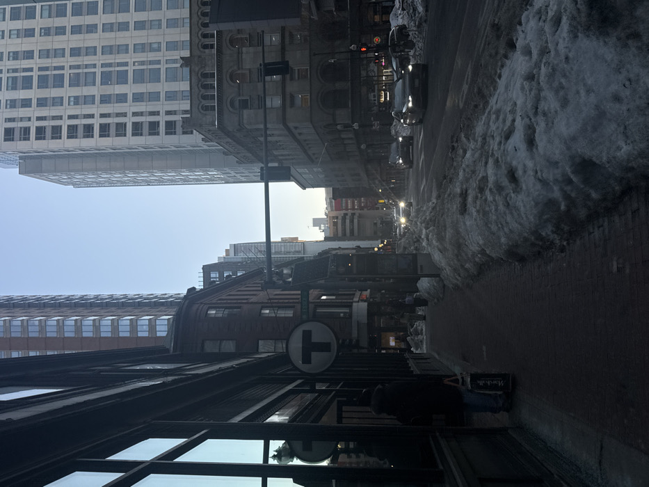 A street scene featuring tall buildings on both sides, including a skyscraper with many windows. A "T" symbol is visible on a sign. The street is lined with snow piles. Cars are driving down the street, with their headlights on. A person stands on the sidewalk, holding a bag. The overall atmosphere is urban and wintery.