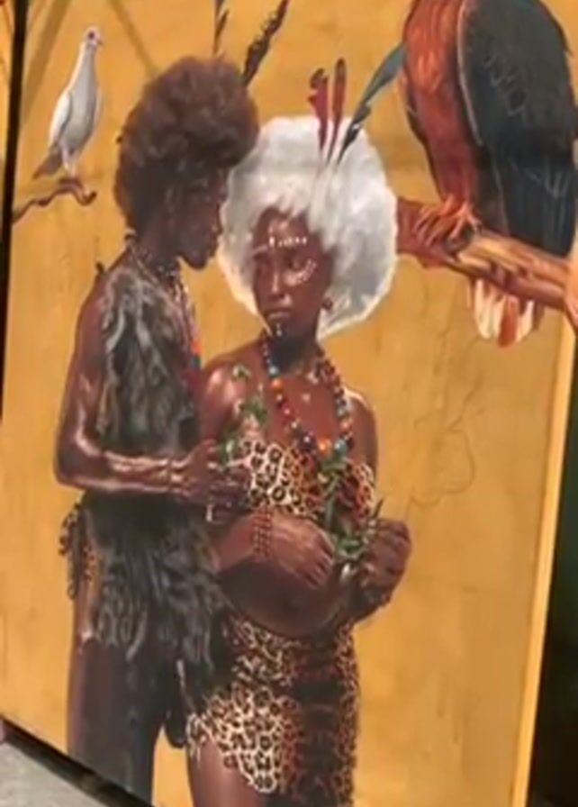 large painting leaning against a wall. The painting depicts a dark-skinned man and woman in what appears to be tribal attire, including animal print clothing, necklaces, and feathers in their hair. The man is on the left and has his arm around the woman. They are holding green leaves. A white dove sits on a branch in the upper left, while a hawk sits on a branch in the upper right. The background is a solid mustard yellow color. The edges of the canvas are visible.